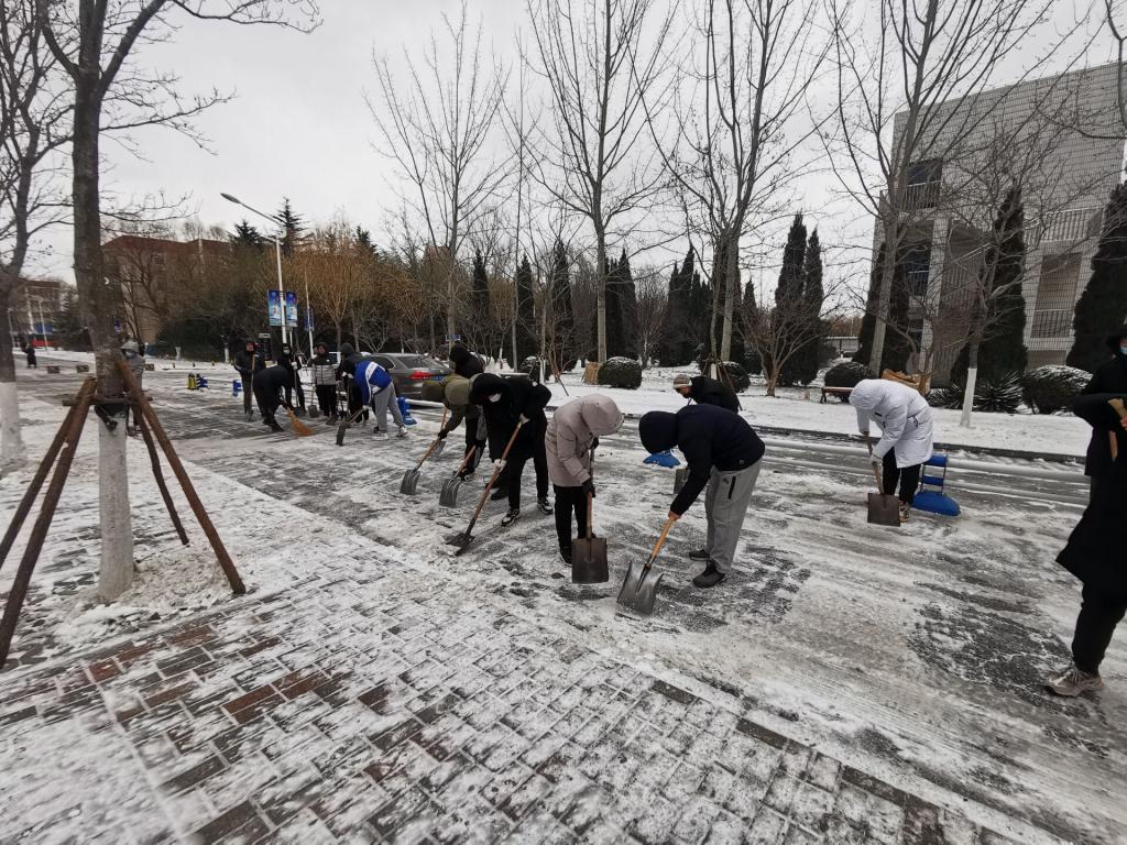 院馆门前主干道的道路积雪清扫工作。分好任务后,同学们不畏严寒,积极主动、相互配合、齐心协力,一点点地将积雪和冰层铲起集中堆放,尽管大家的脸都冻得通红,但手中的扫雪工具却不停地挥舞,扫出了畅通的大道。经过一个多小时的奋战,大家团结协作,以最快的速度将积雪清理干净。校园内的人行通道恢复了畅通、洁净,为学生安全出行创造了最佳环境,雪日里的校园也更加温馨、美丽。