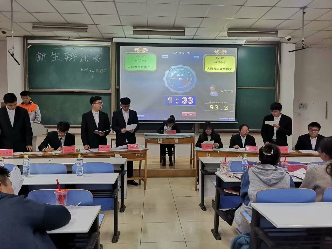 本次决赛分为上、下半区共两场,随着赛事主席对比赛规则的简要介绍,本次辩论赛正式拉开帷幕。开宗明义,立意先行。比赛伊始,双方就各自的辩题展开陈述立意,条理清晰、掷地有声。在上半区的赛场上正方以“人懂得坚持更伟大”为论点,旁征博引、步步紧逼,反方以“人懂得退让”为论点,唇枪舌战、毫不相让。无形的思想火花在双方辩手之间迸发。在质询环节,辩手们针对立论中出现的问题进行辩驳探讨,交互轮转间彰显思维拓展纬度,唇枪舌战中尽展少年思辩智慧。在场观众屏息凝气,认真聆听,屡屡报以热烈的掌声。思维与灵魂的碰撞,无限缩短了我们与真理的距离。在下半区的自由辩论环节,辩手们畅谈时事,针砭时弊,结合多重论证方法就当今中国年轻人应不应该为高房价买单这一论题阐述自己的见解,并针对对方的逻辑缺漏提出质疑反驳。双方滔滔不绝,妙语连连,或激情澎湃或娓娓道来,将现场气氛推向高潮。热烈的比赛氛围、熟练的理论运用及良好的辩风感染了在场的每一位观众。比赛在四辩的总结陈词中落下帷幕。随后,评委们充分肯定了参赛辩手充分的赛前准备和卓越的赛场呈现,并提出了相应指导性建议。最后,经过评审小组的严格打分,机201-6班辩论队在四支队伍中脱颖而出,夺得桂冠。