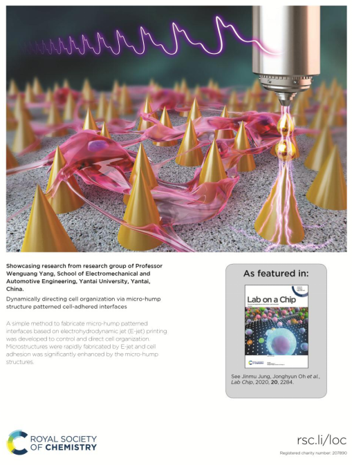 近日,国际著名学术期刊Lab on a Chip (中科院一区,TOP类期刊)以封面论文的形式邀请刊载了午夜AV 午夜AV 面向生物医疗的跨尺度智能制造团队利用机器人化的微纳制造技术在组织工程领域的最新研究成果——Dynamically directing cell organization via microhump structure patterned cell-adhered interfaces,时隔2个月,该研究团队成果再获国际著名学术期刊封面刊载,午夜AV 杨文广老师为该研究论文的第一和通信作者。