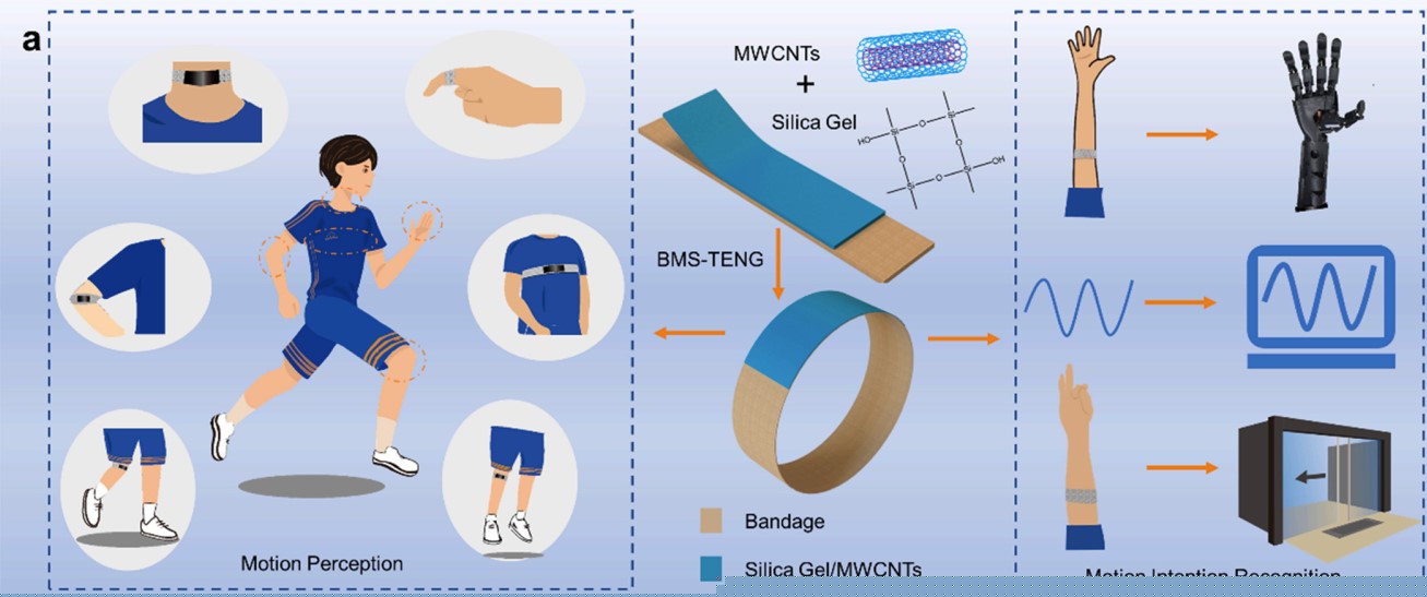 本论文提出了一种基于多壁碳纳米管(MWCNTs)、可拉伸硅胶和自粘弹性绷带制作的摩擦纳米发电机(BMS-TENG),该BMS-TENG具有自粘性,可以方便固定在人体任意位置。同时,BMS-TENG还具有良好的拉伸性能,最大能实现502%的拉伸率。其次,BMS-TENG可以收集各种人体运动和生理信号,如弯曲手指和肘部,抬腿,呼吸,吞咽等。另外,在机器学习的辅助下,提出了一种能够获取运动信号并识别运动意图的智能绷带系统。作为实际应用,智能绷带系统通过监测前臂肌肉收缩产生的信号,可以实时操纵机械手完成不同的手势以及进行个人身份识别。因此,该系统在人体运动监测、电子皮肤、人机交互、手势识别、生物医学等领域具有广阔的应用前景。