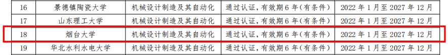机械设计制造及其自动化专业名列其中,认证有效期6年(有条件),有效期起止时间为2022年1月至2027年12月。至此,我院符合认证条件的专业均通过了工程教育专业认证。
