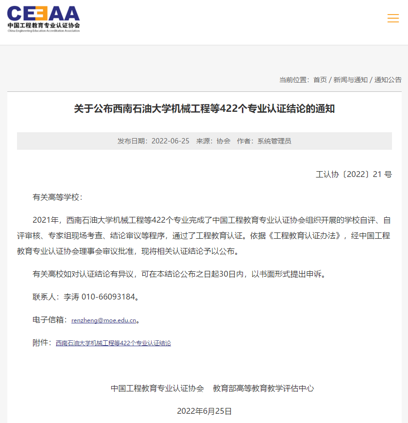 近日,教育部高等教育教学评估中心和中国工程教育专业认证协会正式发布了《关于公布西南石油大学机械工程等422个专业认证结论的通知》(工认协〔2022〕21号),对2021年度工程教育专业认证结论进行了公示。经过学校自评、自评审核、专家组现场考查、结论审议等程序,午夜AV